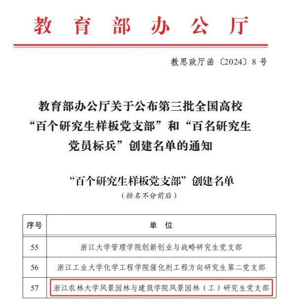 近日,教育部公布了第三批全国高校“百个研究生样板党支部”和“百名研究生党员标兵”培育创建单位名单。根据《教育部办公厅关于开展第三批全国高校“百个研究生样板党支部”和“百名研究生党员标兵”创建工作的通知》(教思政厅函〔2023〕16号)安排和遴选工作方案,经省级党委教育工作部门推荐、资格审查、专家评审、集中审议,遴选产生了100个研究生样板党支部和100名研究生党员标兵。在本次评选中,我院风景园林(工)研究生党支部入选第三批全国高校“百个研究生样板党支部”培育创建单位。