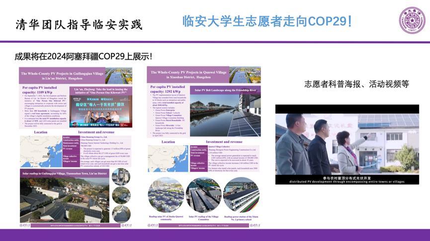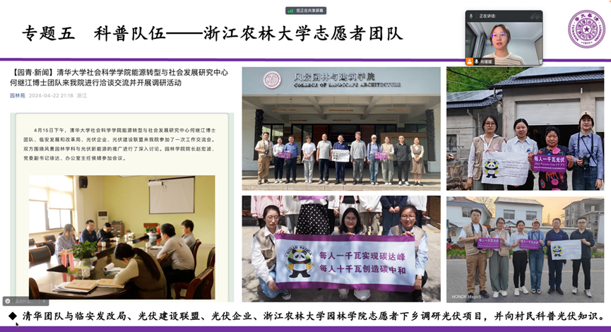 研究中心的肖媛媛老师汇报了清华团队与临安区发改局合作的“每人一千瓦光伏”课题进展,介绍了临安上沃村的农光互补案例、5种村镇光伏共富模式,以及各方社会力量在农村能源转型中的努力,使与会人员更全面地了解到光伏在乡村场景应用的创新与实践。肖老师还梳理了两校通过该课题建立起的紧密联系,并且强调大学生志愿者在农村能源转型科普队伍中的重要性,坚信志愿者在中国乃至世界低碳事业发展中大有可为。