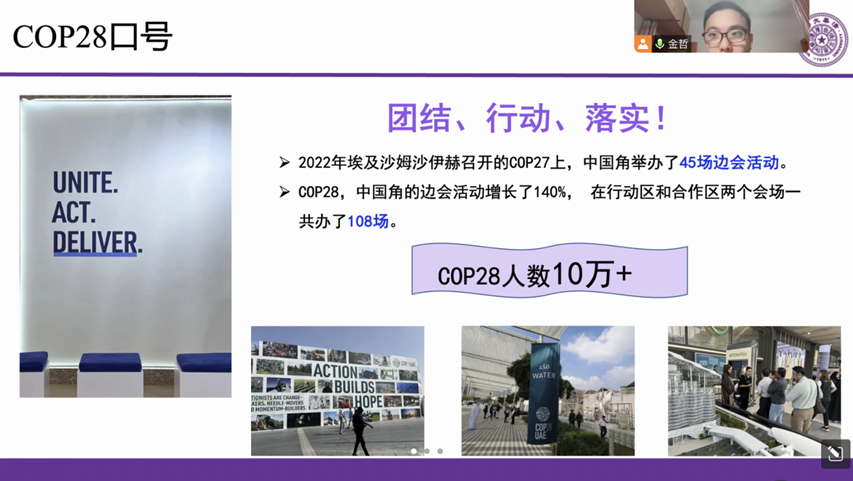随后,清华团队的金哲博士向志愿者分享了参与2023年迪拜COP28联合国气候变化大会的亲身经历。金博士详细阐述了联合国气候变化大会的核心议题及其深远影响,为学生们揭开了全球气候治理的面纱,并以甘肃东门村“光伏+热泵”的实践案例向志愿者们分享了中国在推动零碳乡村建设方面的创新尝试。