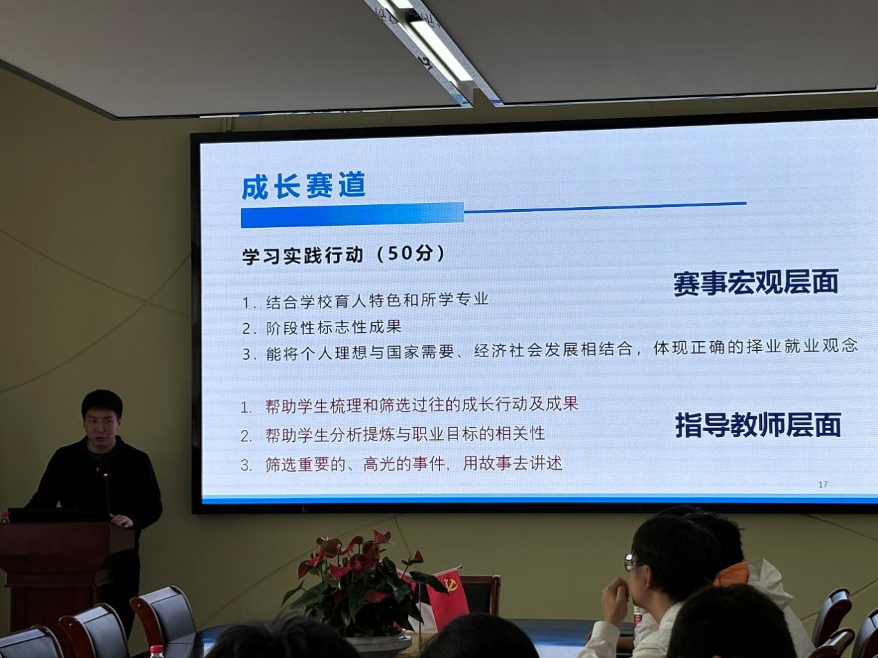 宣讲会开始时,赵鑫磊老师对潘辰豪老师进行了介绍。之后,潘辰豪老师从往届职规赛的优秀成果、职规赛的要求、选手可能碰到的问题等方面展开讲解。宣讲会结束后,同学们向潘老师提出自己在职规赛中遇到的难点,潘辰豪老师耐心地进行了指导。