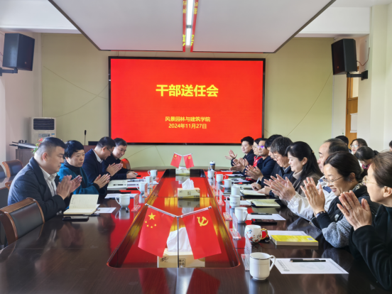 11月27日上午,园林学院召开干部送任会。校党委副书记施美红、组织部副部长方殷杰出席会议。学院党政领导班子成员、学科专业负责人、两办主任、党支部书记、工会团委负责人、高级职称代表等参加会议。
