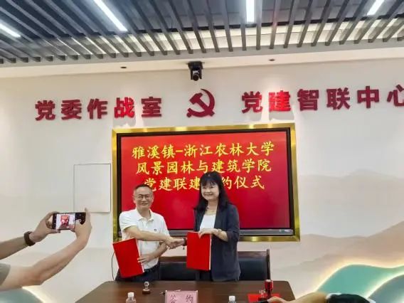 活动中,雅溪镇与园林学院举行党建联建签约仪式。在雅溪镇党委书记蓝煜斌的陪同下,园林学院一行实地考察了雅溪镇的乡村建设、产业发展、文旅融合及基层治理等情况,为后续深入合作奠定了坚实基础。
