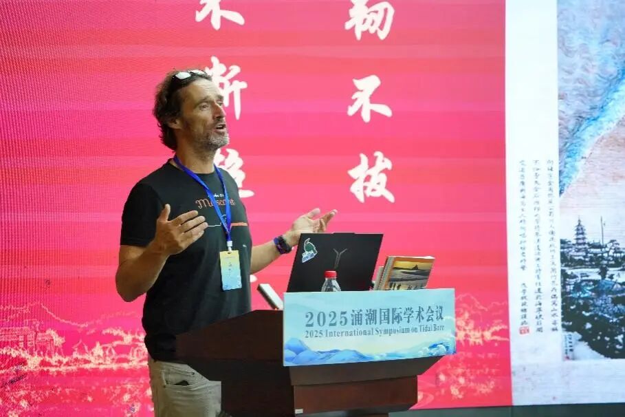 中国国家冲浪队的意大利籍教练尼克,从历史文献与文化符号视角解读钱塘江大潮“人潮互动”传统,考证出“世界冲浪源于中国”的重要观点,指出千年前“弄潮”已是中国独特文化活动。