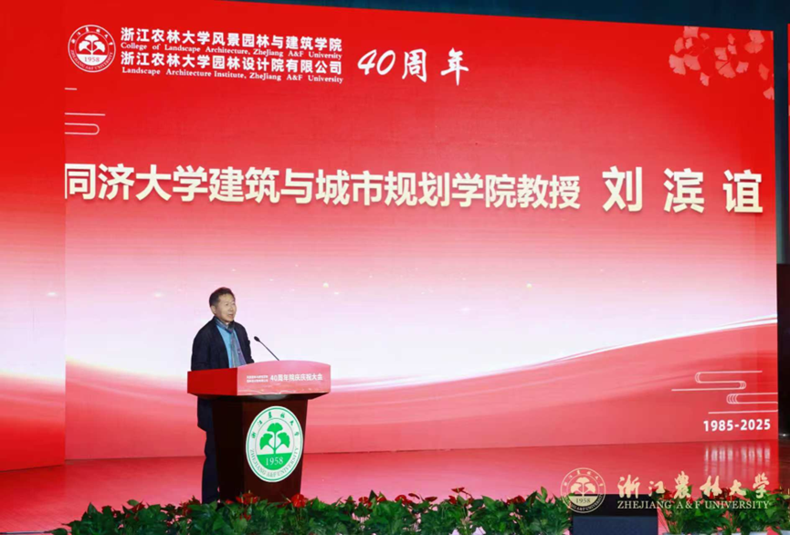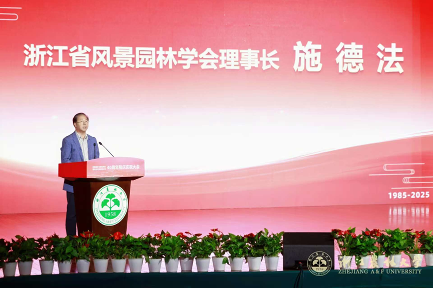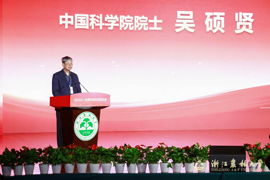 吴硕贤院士致贺词,肯定了园林学院四十年来在风景园林与建筑学科的创新实践、人才培养及对人居环境与城乡发展的贡献,建议学院进一步强化跨学科与产学研协同,培养全球视野人才,并在绿色低碳、乡村景观、文化遗产数字化、国际合作方向推进,为我国人居环境建设贡献智慧。