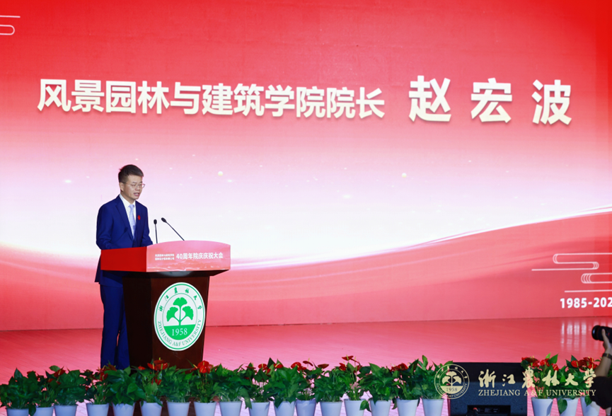赵宏波院长作学院发展报告,他回顾了学院从单一学科到本硕博贯通的四十年发展历程,并总结了在学科建设、人才培养、科学研究与社会服务等方面取得的系列成果,表示学院将继续弘扬“三干”精神,在“十五五”新征程中,谱写园林事业新篇章!