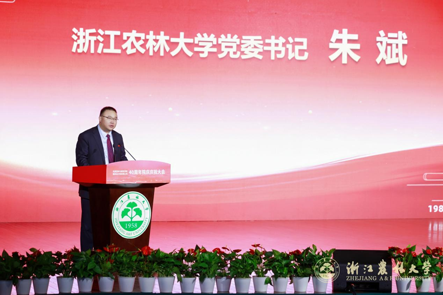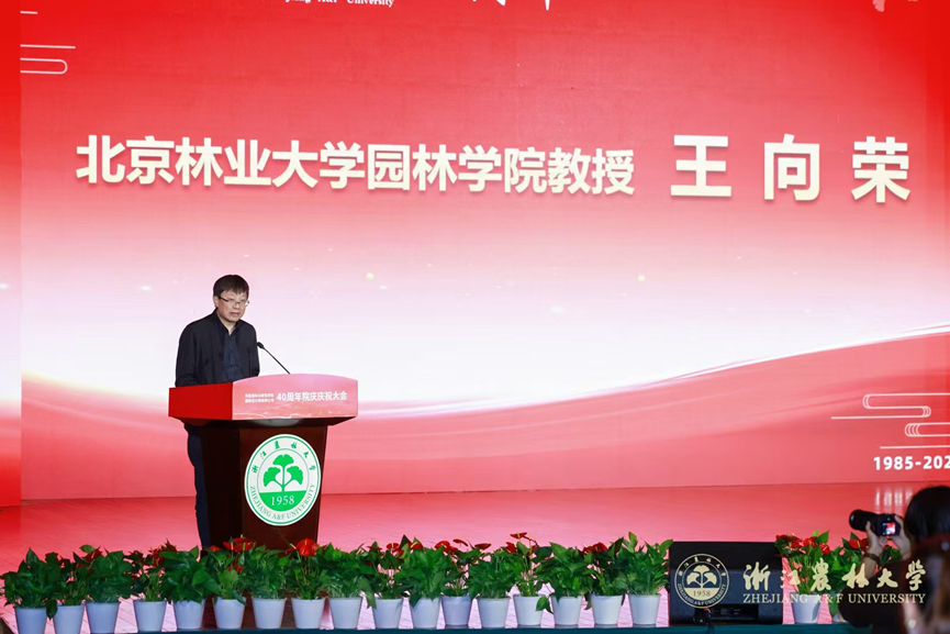 朱斌书记代表学校致贺词,追溯了园林学院从建系之初的“初心种子”,到成长为国内外具有重要影响力的高水平学院历程。他对学院在立德树人、学科前沿、文化传承、社会服务等方面取得的成绩表示肯定,希望学院进一步聚焦一流学科建设、深化改革创新、强化党建引领,为中华民族伟大复兴贡献园林力量。