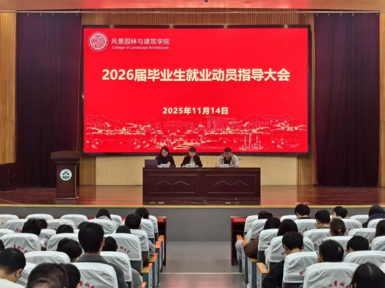 11月14日,为应对当前就业形势,精准助力学生发展,园林学院2026届毕业生就业动员指导大会在图书馆第一报告厅顺利召开。园林学院党委书记徐丽华、党委副书记张孟镇,学生办相关老师以及2026届全体毕业生参加了此次大会。会议由园林学院学生办主任蔡梦莎主持。