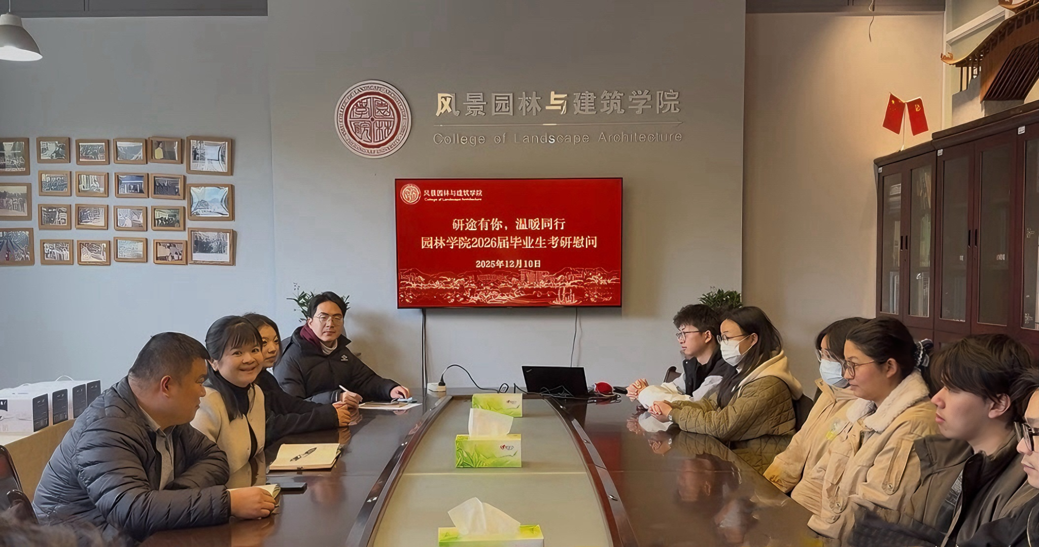 12月10日下午,园林学院于陈方斋开展了2026届毕业生考研慰问活动。学院党委书记徐丽华、副书记张孟镇参加慰问活动,与2026届考研学生代表相聚一堂,代表全院师生向正在紧张备考的学子们传达了最深切的关怀与最真挚的祝福。