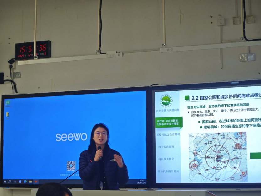 青年教师陈丹秀博士受邀在“‘两山’理念与国家公园绿色发展”分论坛作专题发言,依托团队近年在钱江源国家公园(候选区)开展的多尺度实践,探讨通过规划设计促进国家公园与毗邻城市协同发展的关键机制。