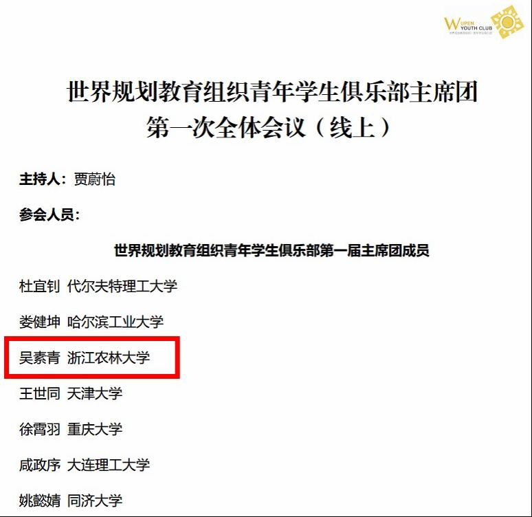 近日,世界规划教育组织公布了青年学生俱乐部首届主席团成员。经过层层选拔,我院城乡规划专业大二本科生吴素青成功当选。主席团其他成员还包括来自荷兰代尔夫特理工大学,以及同济大学、天津大学、哈尔滨工业大学、重庆大学、大连理工大学6所国内外知名院校的本科生和硕博研究生。