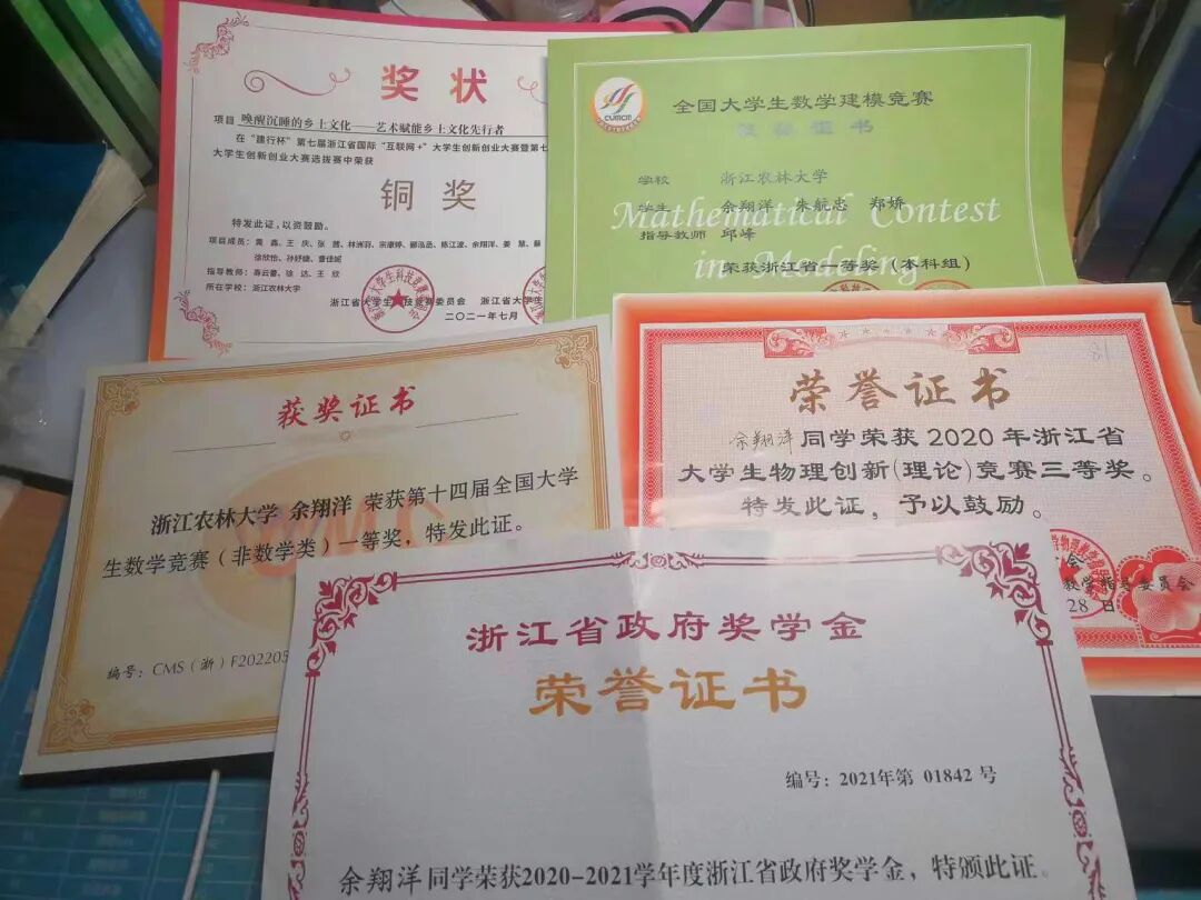 曾连续两年获得浙江省政府奖学金,参与申报浙江省新苗人才计划(省级科研训练项目),与所在团队联合发表论文《微环境对农宅夏季用能的影响—以浙江省新农村住宅为例》,获得2022年全国大学生数学竞赛一等奖(二类竞赛)、2021年全国大学生数学建模竞赛浙江省一等奖(一类竞赛)、2021年互联网+创新创业大赛浙江省铜奖(一类竞赛)、2020年浙江省大学生物理创新竞赛省三等奖(二类竞赛)和2020年浙江省结构竞赛校特等奖(一类竞赛)等奖项。