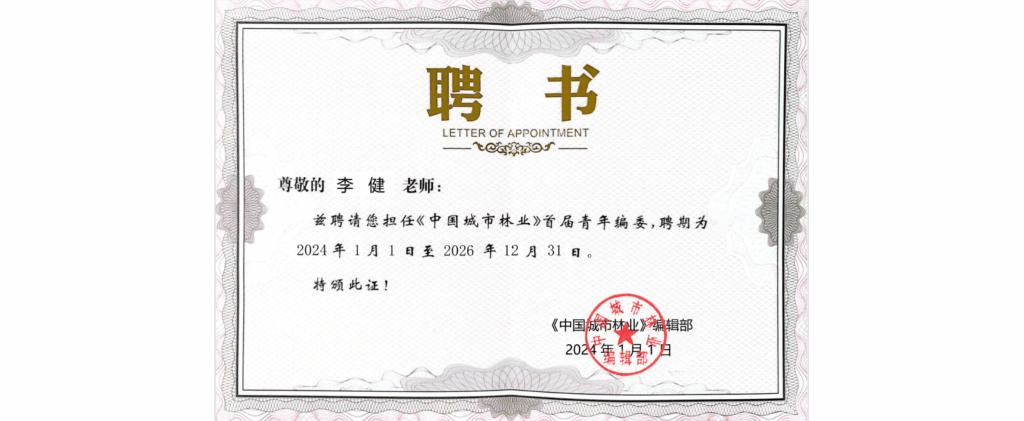 为深入贯彻党的二十大精神,认真落实习近平总书记指出的“要办好一流学术期刊和各类学术平台,加强国内国际学术交流”的指示精神,进一步提升期刊的学术质量,促进学术交流,实现专家办刊,《中国城市林业》面向全国相关高校、科研院所等公开招募首届青年编委。日前,李健教授应邀担任该刊青年编委会委员。此前,李健教授已担任国家林草局《自然保护地》期刊编委,Cities, Tourism Management, Journal of Outdoor Recreation and Tourism等国际期刊审稿人。