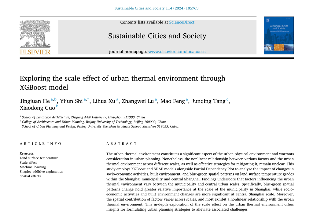 近日,城乡规划学科城乡生态环境评估与规划团队在国际权威刊物《Sustainable Cities and Society》(中科院一区TOP,IF: 10.5)上发表题为“Exploring the scale effect of urban thermal environment through XGBoost model” (基于XGBoost模型的城市热环境尺度效应研究)的学术论文。williamhill体育中文为该论文第一单位和通讯作者单位。该团队施益军副教授为通讯作者,研究生何静娟为第一作者,徐丽华教授、陆张维副教授、冯矛老师等共同参与。