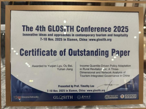 本届大会面向全球学界征集概念性、实证性、方法论研究及案例研究论文,并评选出多篇“会议优秀论文(OPC)”。其中,我院白鸥教授与其MTA 2025级研究生吕雨倩合作完成的学术论文Income Quantile-Driven Policy Adaptation in Rural Revitalization: A Three-Dimensional and Network Analysis of Tourism-Integrated Governance in China乡村振兴中收入分位数驱动的政策调适:中国旅游一体化治理的三维审视与网络解析》,荣获“最佳论文”荣誉。