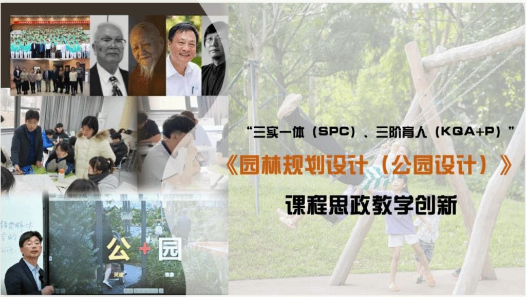 课程以思政价值为引领,紧跟“生态文明、美丽中国”等战略,以“文化与生态”为主线,以“公园设计五步法”为核心,以实践为触媒构建“三实一体(SPC)”课程思政实施路径,创新规划设计类课程思政“三阶育人(KQA+P)”教学模式,将高阶能力培养与思政育人融为一体,产教融合,强化专业服务社会能力,培养拥有扎实专业基础、富有创新创造能力、心有责任担当、胸怀情怀大爱的美丽中国建设接班人。