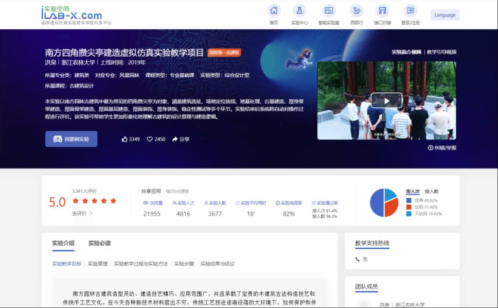 《古建筑设计》是我国建筑学、风景园林等专业本科教学的重要内容。然而,由于古建筑构件种类繁多、安装过程复杂,在课堂教学中无法充分展示其建造过程;在实地调研中,由于古建筑安装结束后,很多构件被隐藏,学生难见全貌;同时,受场地和教学资源所限,许多学校尚不具备制作或展示实体型的条件,学生更无法独立进行建造操作。为解决这一教学难题,课程团队借助3D仿真技术、多媒体技术和网络技术,以南方园林古建筑中最为常见的四角攒尖亭为对象,设计3课时的仿真建造实验,涵盖建筑选址、场地定位放线、地基处理、台基建造、屋身骨架建造、屋面骨架建造、屋面基层建造、屋面装饰、屋身装饰等多个环节。本项目的开放运行依托开放式虚拟仿真实验教学管理平台,集仿真建造、智能指导、结果验证、自动批改和教学管理于一体,具有良好的自主性、交互性和可扩展性。通过本实验,学生可以形象化地理解古建筑设计原理与建造逻辑,实现“以点带面”的学习效果,并在交互操作中激发学习兴趣和对传统技艺的热爱、同时增强空间想象力和实践动手能力。本项目已在国家虚拟仿真实验教学课程共享平台运行多年累计浏览量超2万次、实验人次近5000,获得广泛好评。