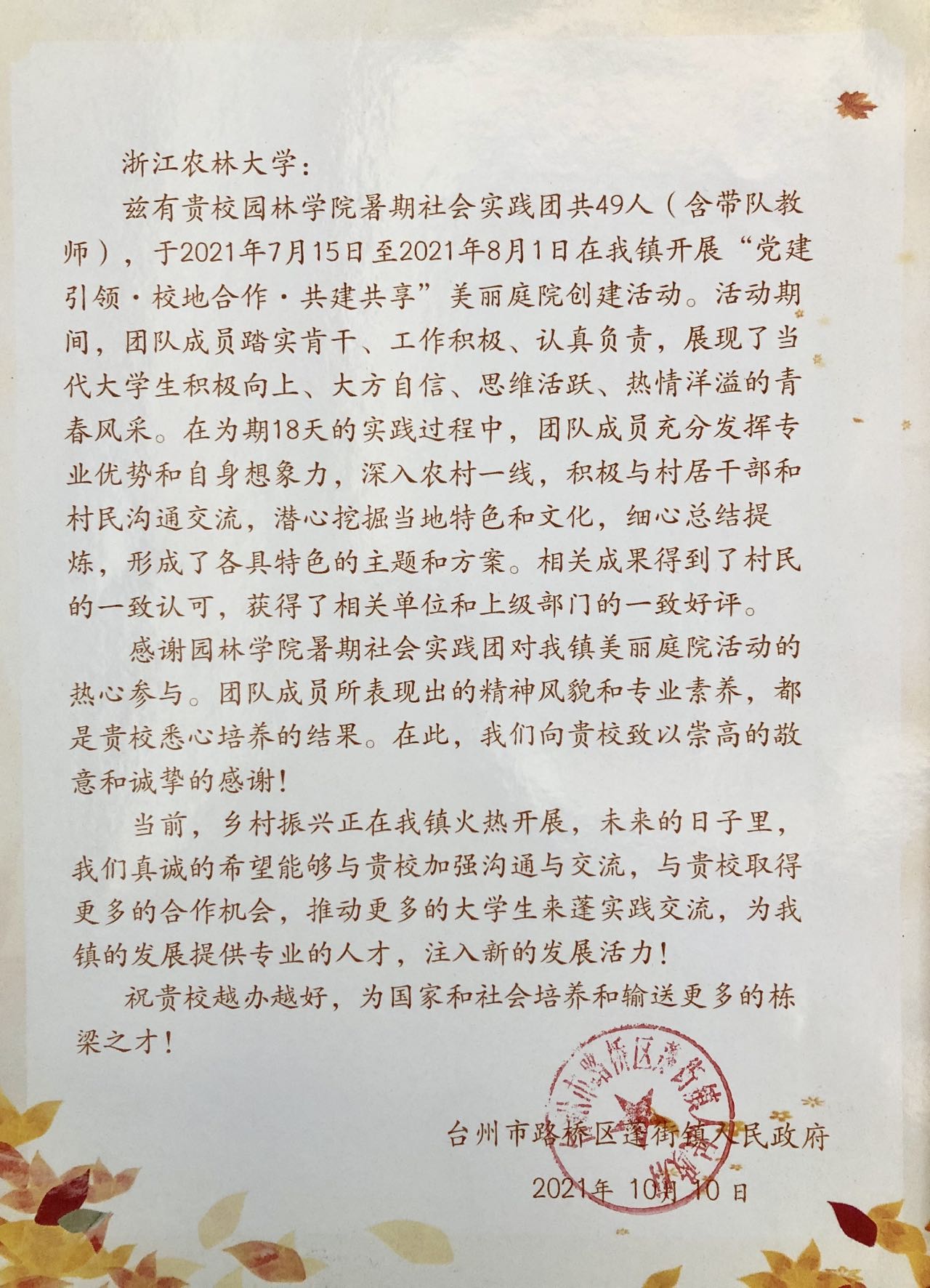 近日,台州市路桥区蓬街镇人民政府发来感谢信,对我校园林学院“艺术振兴乡村—助力共同富裕”暑期社会实践团在蓬街镇“党建引领,校地合作,共建共享”美丽庭院创建活动予以肯定和表扬,并颁发了荣誉证书。