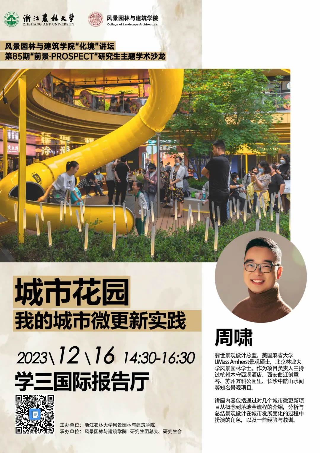讲座内容包括通过对几个城市微更新项目从概念到落地全流程的介绍,分析与总结景观设计在城市发展变化的过程中扮演的角色,以及一些经验与教训。