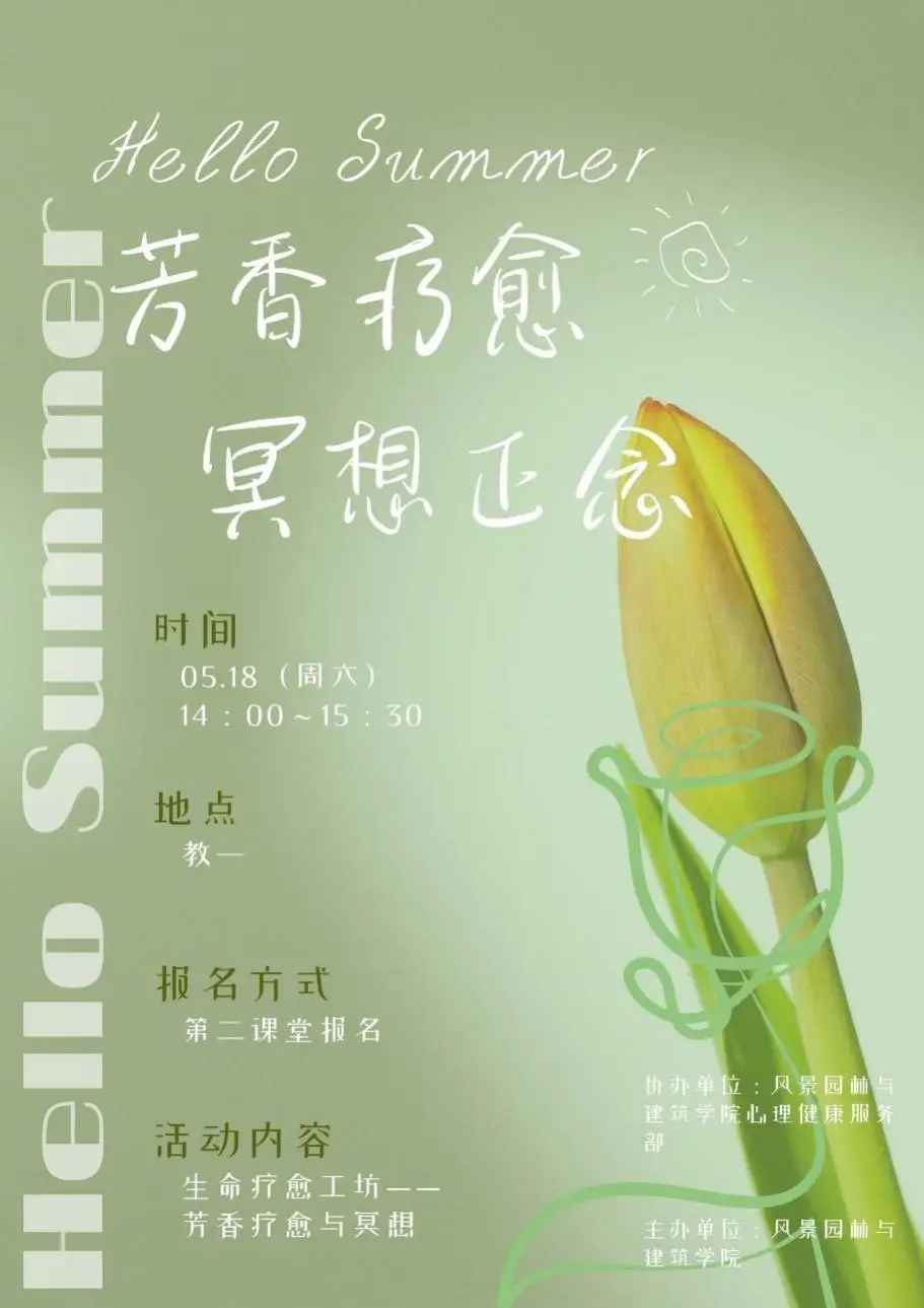 在这次活动中,我们将结合芳香疗愈与冥想正念,引导同学们在芳香之间、自然之中寻找到内心的安宁。通过这一过程,同学们不仅可以释放内心的压力,感受心灵的治愈,还可以学习冥想艺术,调节日常生活中的精神压力。
