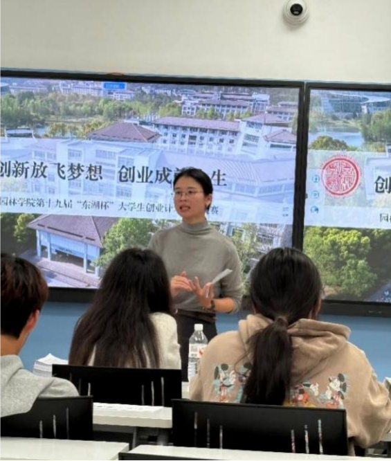 为进一步提升我院学生的思维活力以及创新创业能力,近日,我院第十八届"东湖杯"大学生创新创业竞赛在教一507顺利举行。园林学院教师陈丹秀,学生办主任蔡梦莎,团委书记赵鑫磊,辅导员牛欣然、王淏担任此次比赛的评委。